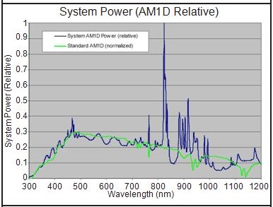 實際輸出光譜可能會因燈的狀況和空氣過濾器的制造公差而有所不同。為了簡化我們的太陽模擬器的光譜曲線與ASTM E927-10標(biāo)準(zhǔn)曲線的直觀比較,將模擬器的輸出歸一化為相應(yīng)的標(biāo)準(zhǔn)光譜。